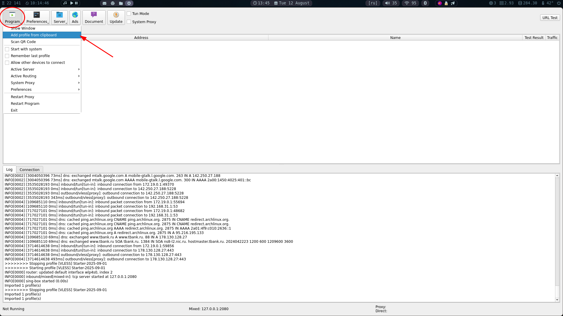 В выпадающем меню выбираем "Add profile from clipboard" (Вставить профиль из буфера обмена).